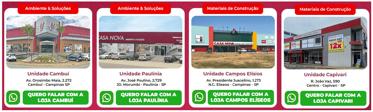 Hoje, a Casa Nova está presente em Campinas (Cambuí e Campos Elíseos), Paulínia e Capivari, unindo tradição e inovação em cada uma de suas unidades. Cada loja preserva sua identidade e valor local, com ambientes modernos, profissionais qualificados e a missão de tornar o processo de construir ou reformar uma experiência agradável, acessível e inspiradora.