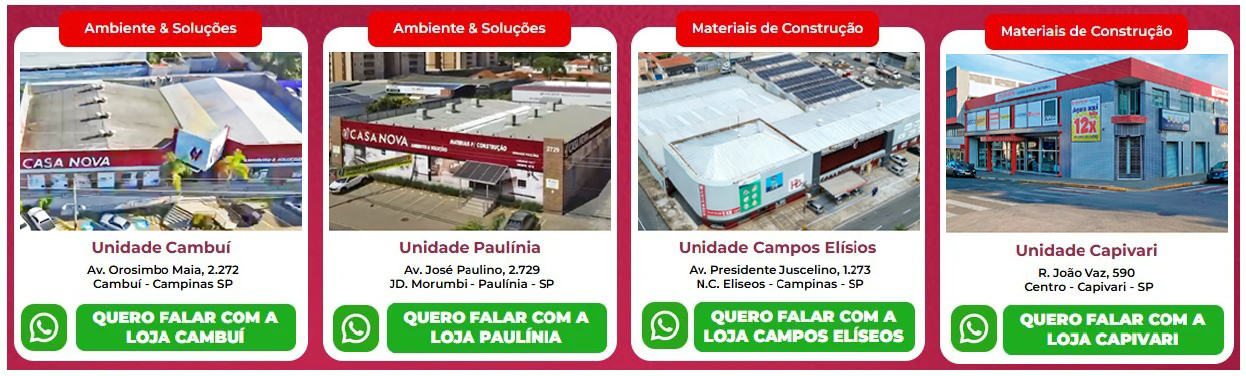 Empresa que se consolidou na região como a principal loja do segmento sendo genuinamente campineira, assim podemos definir a Casa Nova materiais para construção. Inaugurada em 1976 a empresa se destaca através dos anos por praticar diversas ações de sustentabilidade, oferecendo um atendimento diferenciado junto de uma politica de preços baixos. Participa também de varias ações sociais, conquistando assim a confiança dos consumidores.